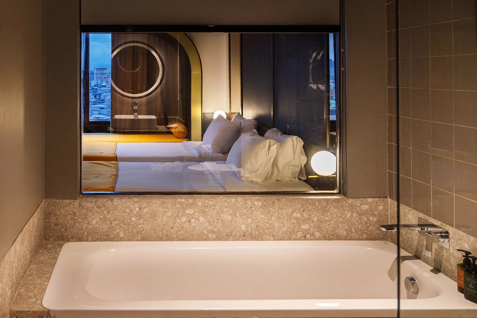 Family Suite are comfortable for big family or friend traveling together provide you a working desk with chairs and a smart television while the bedroom features oversize windows with view to Bangkok’s city center.